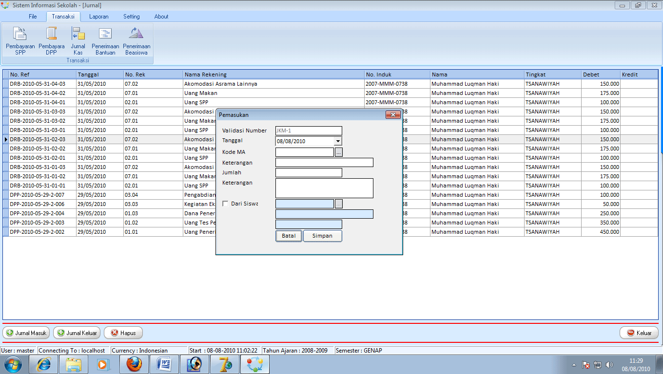 Software sekolah ini dilengkapi dengan berbagai fitur penting yang memudahkan administrasi pendidikan. Pengguna dapat melakukan input data siswa, kelas, wali kelas, mata pelajaran, dan guru dengan mudah. Sistem ini mendukung transaksi pembayaran seperti spp bulanan, uang pendaftaran mahasiswa baru, serta transaksi custom sesuai kebutuhan sekolah. Fitur absensi untuk guru dan siswa juga tersedia, bersama dengan pengelolaan data nilai. Administrator memiliki kontrol penuh untuk mengatur akses pengguna, baik guru maupun siswa, sehingga setiap pihak dapat mengakses informasi yang relevan. Selain itu, software ini memungkinkan pencetakan laporan keuangan, seperti daftar pemasukan dan pengeluaran, serta laporan cash flow, neraca saldo, dan laporan data siswa serta pegawai. Dengan dukungan client-server dan jaringan lokal, sistem ini dapat diakses secara efektif dalam lingkungan sekolah.